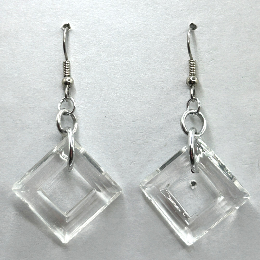 Glass squares hang from standard silver-colored ear wires. The squares are about an inch on each side.