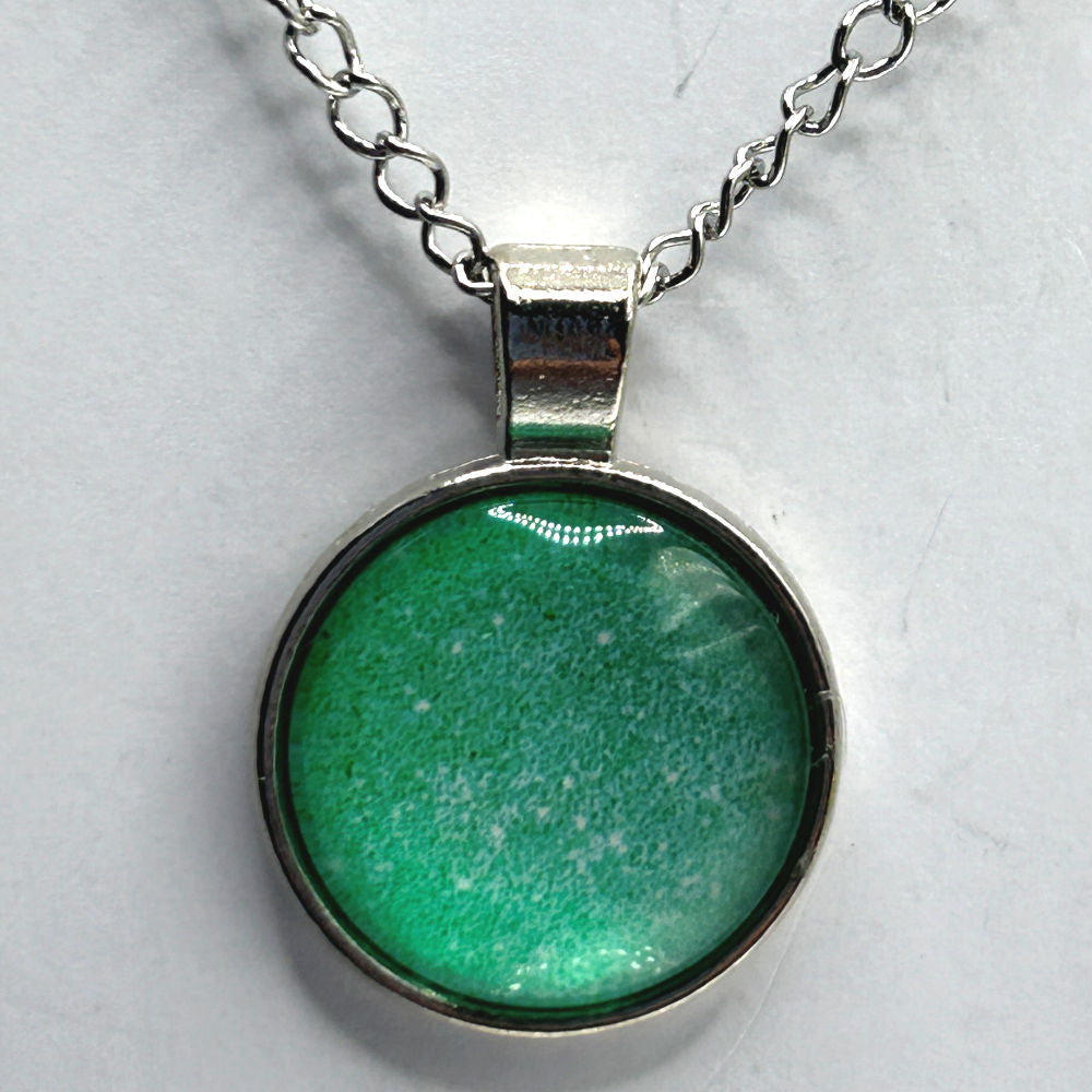 A 3/4 inch diameter glass cabochon pendant hangs from an 18 inch stainless steel chain.