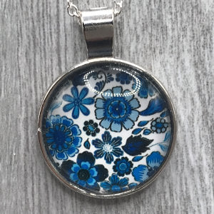 A 3/4 inch diameter glass cabochon pendant hangs on a very thin 20-inch silver-colored chain. These are pretty similar - choose by the picture shown.
