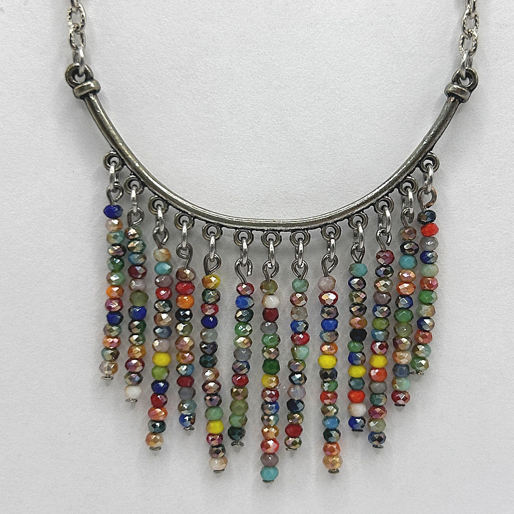 This half-circle is about 2 1/4 inch wide and an inch tall and it has dangling lines of sparkling Czech glass beads that are 1 to 1 1/4 inches long. The pendant hangs on a total of 20 inches of fancy chain.