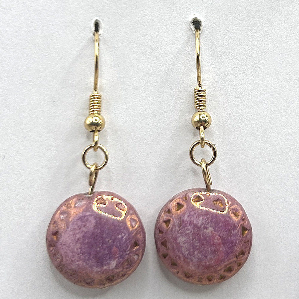 These purple discs are dotted around the edge and have a golden sheen. They are about 1/2 inch in diameter ad they hang on gold-colored ear wires.